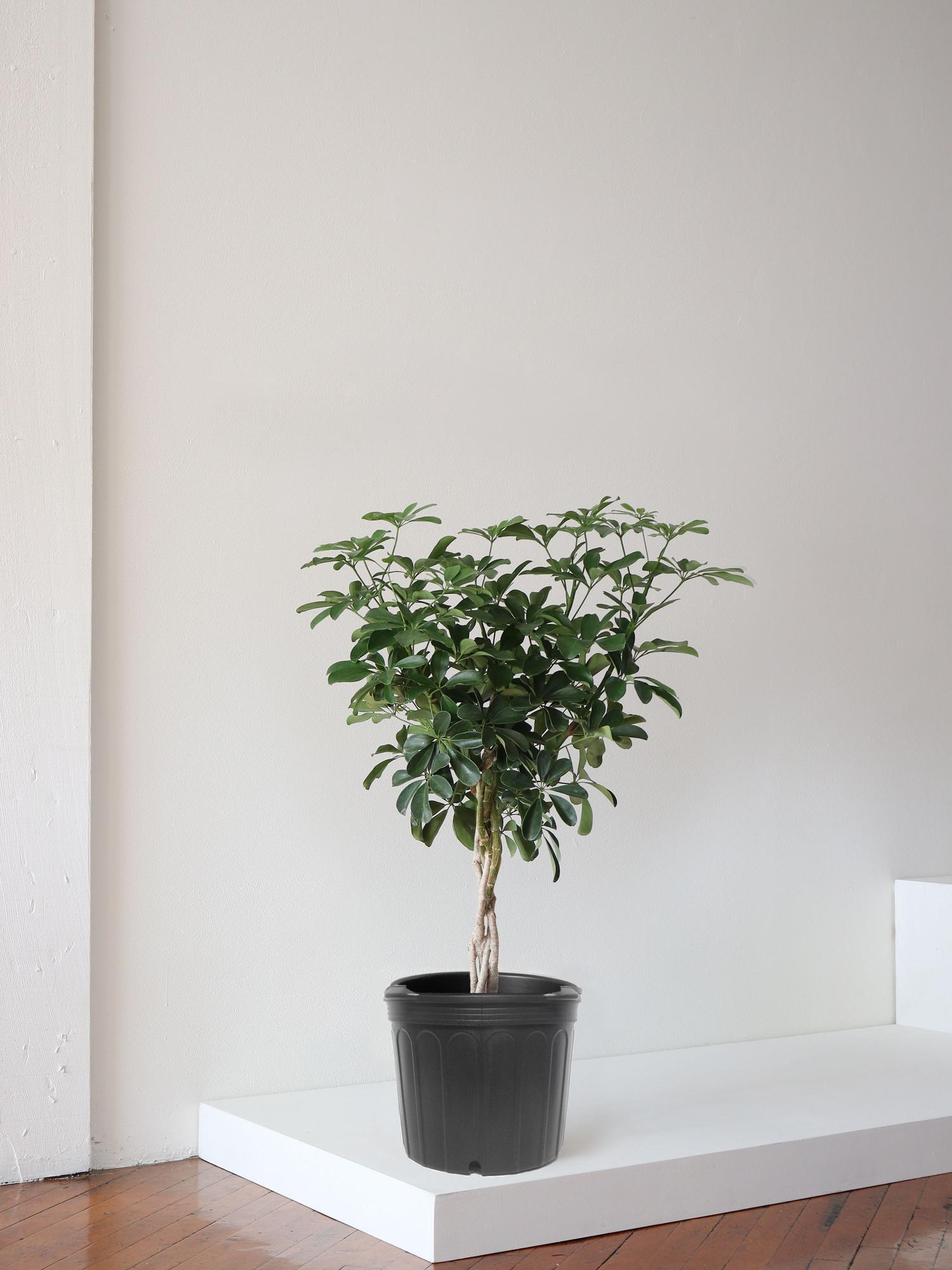 A gorgeous statement tree with an air-purifying punch, the Braided Schefflera is renowned for its abundant canopy of oval leaves that grow in circular, umbrella-shaped configurations. Hardy and resilient, the Schefflera needs watering only when its topsoil is dry, and thrives in medium to bright indirect light.