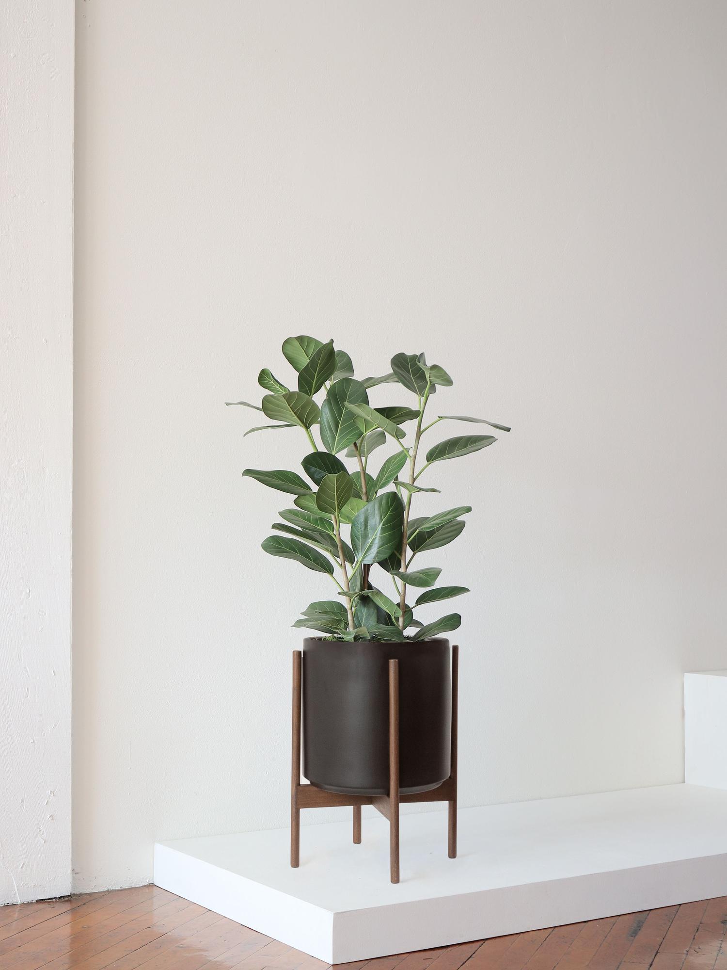 Our Mid-Century collection pairs high-fire ceramic pots with reclaimed wood stands, offering a nod to classic design with a focus on sustainability. Teak is used for light and dark stands, while black stands feature durable mahogany, underscoring our commitment to sophisticated indoor gardening and environmental responsibility. Designed and engineered with form and function in mind, these pieces are perfectly sized, water sealed, surface safe, and made from non-toxic materials.