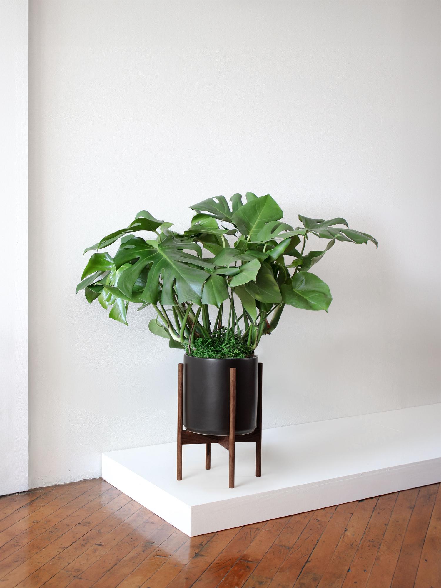 Our Mid-Century collection pairs high-fire ceramic pots with reclaimed wood stands, offering a nod to classic design with a focus on sustainability. Teak is used for light and dark stands, while black stands feature durable mahogany, underscoring our commitment to sophisticated indoor gardening and environmental responsibility. Designed and engineered with form and function in mind, these pieces are perfectly sized, water sealed, surface safe, and made from non-toxic materials.