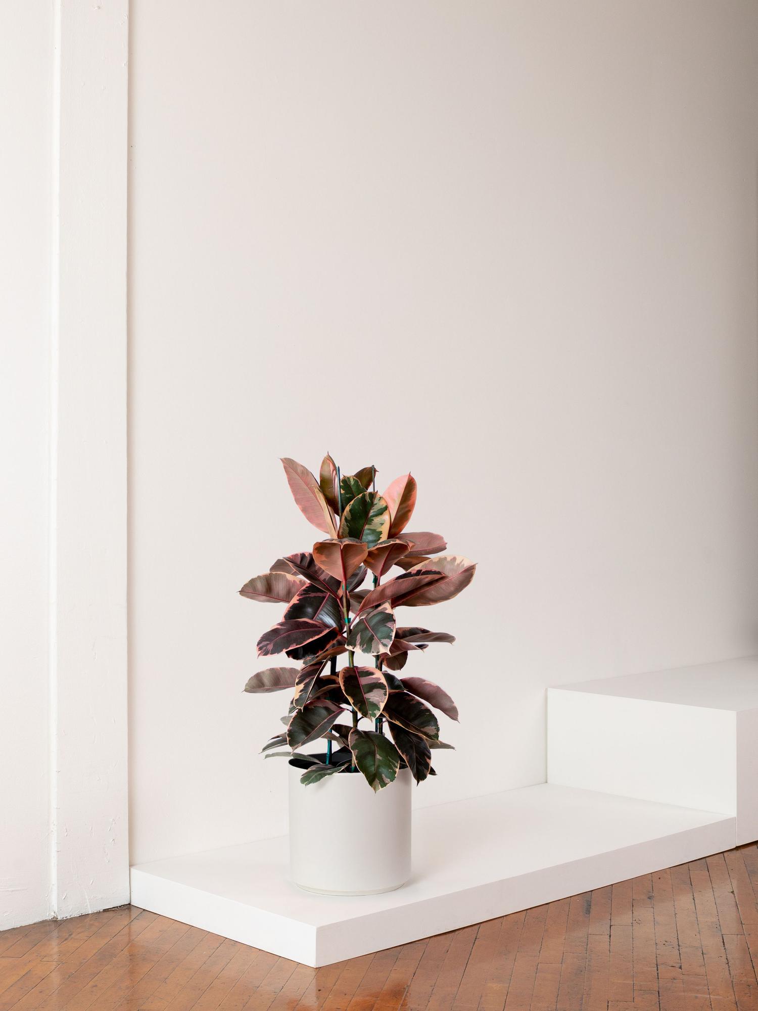The strawberry-and-cream colored leaves of the Ruby Rubber Tree make it a unique option for any indoor space. This plant grows quickly in ideal conditions and requires bright indirect light to maintain its stylish color.