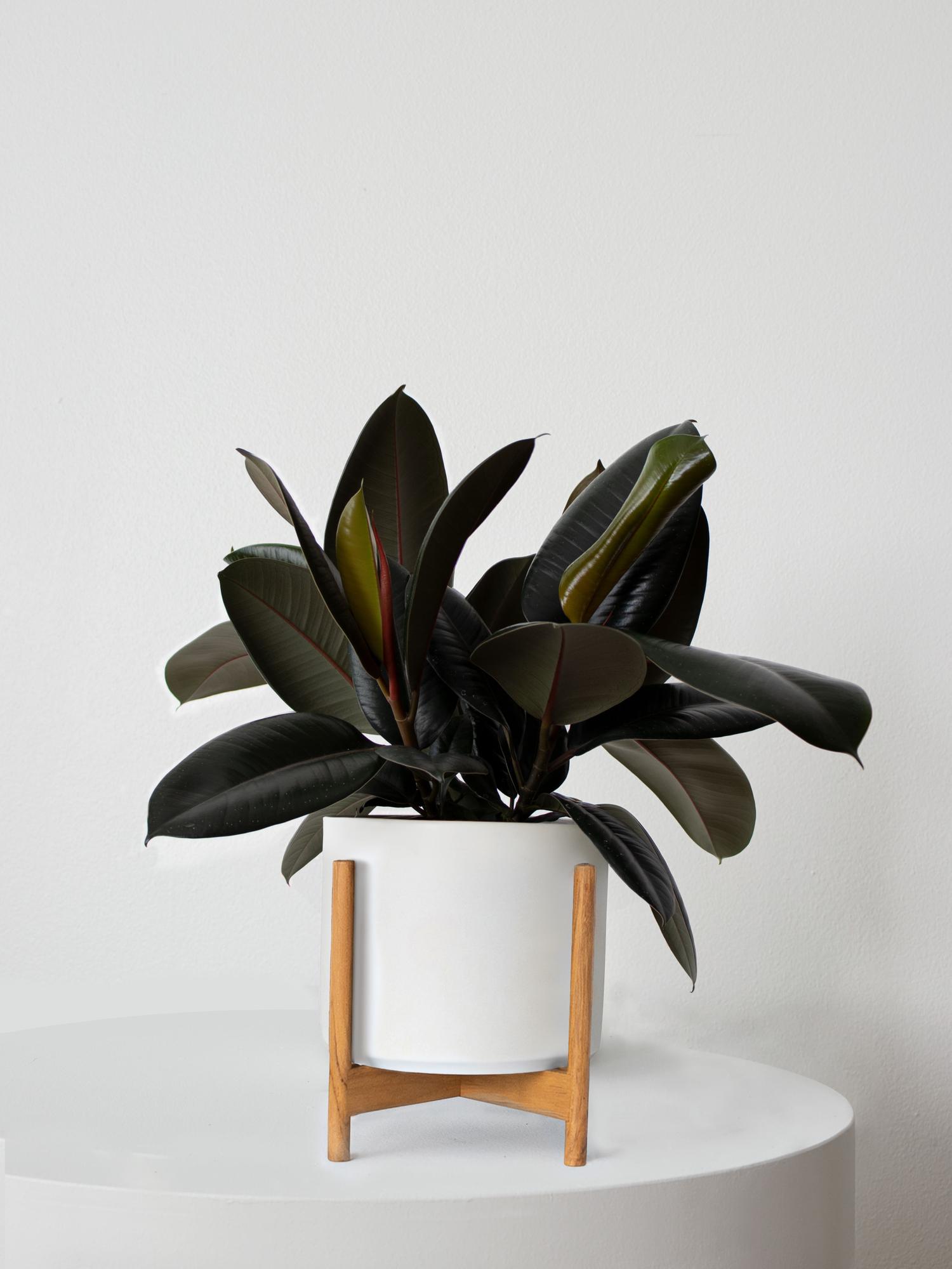The burgundy-colored leaves of the Rubber Plant makes it a unique option for any indoor space. This plant grows quickly in ideal conditions and is easy to care for, with new leaves frequently sprouting from crimson red casings.