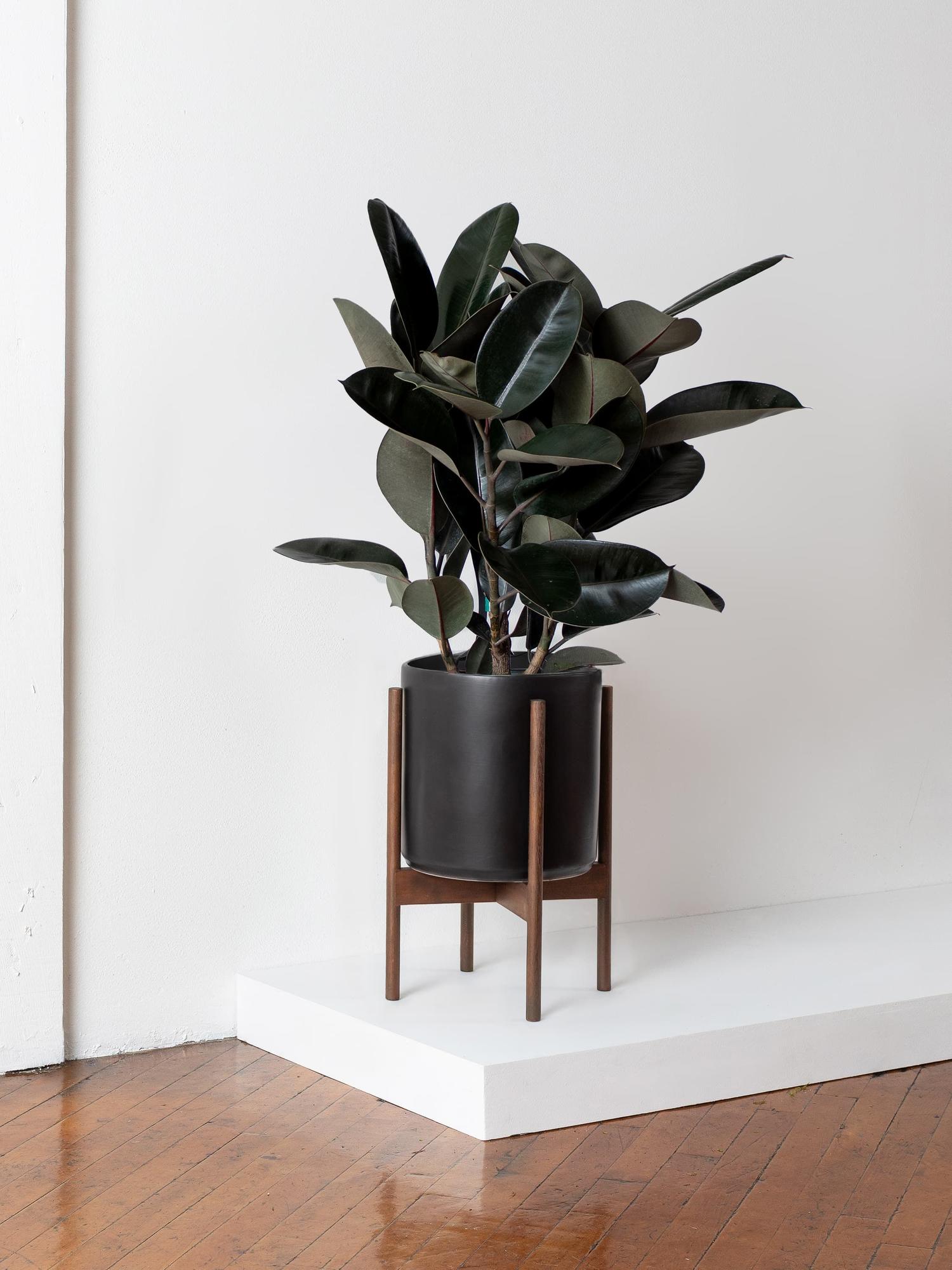 Our Mid-Century collection pairs high-fire ceramic pots with reclaimed wood stands, offering a nod to classic design with a focus on sustainability. Teak is used for light and dark stands, while black stands feature durable mahogany, underscoring our commitment to sophisticated indoor gardening and environmental responsibility. Designed and engineered with form and function in mind, these pieces are perfectly sized, water sealed, surface safe, and made from non-toxic materials.