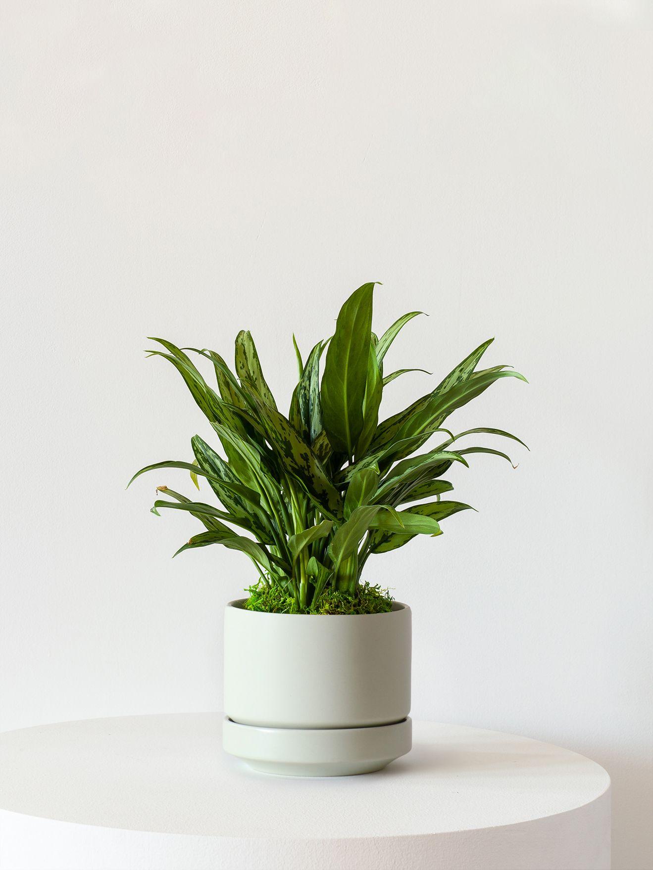 The Tiger Evergreen is one of over 20 different varieties of the Aglaonema, or Chinese Evergreen, family. Native to the tropical rainforests of Southeast Asia, these beautifully lush and colorful plants have quickly become a staple for interior plant styling thanks to their easy going nature and ability to thrive with little or artificial light.
